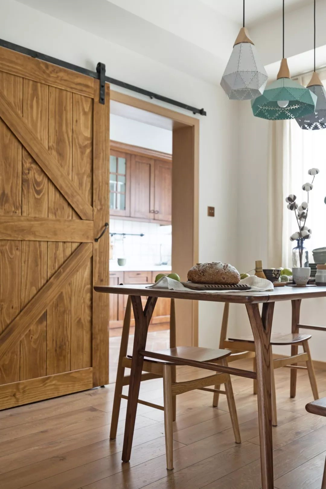 玄關(guān)門廳的側(cè)方就是餐廳空間,木地板搭配木質(zhì)的餐桌椅,在白墻的襯托下顯得格外的輕松、舒適。餐廳和廚房之間用谷倉門作為隔斷。