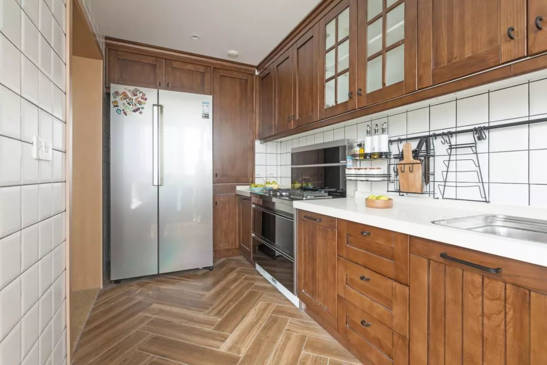 廚房內(nèi)部做了U型的櫥柜布局,冰箱也被嵌入柜子當(dāng)中,地面人字鋪貼的木紋磚和木質(zhì)的櫥柜相互呼應(yīng),顯得整個廚房都很有自然感。