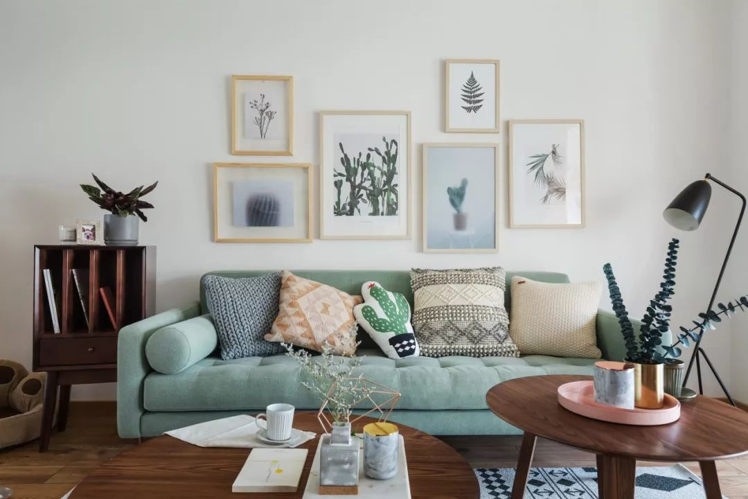 客廳的沙發(fā)選擇了亮色系的,再加上沙發(fā)背景墻上的綠植裝飾畫,讓客廳不會那么單調(diào),多出了一絲文藝小清新的感覺。