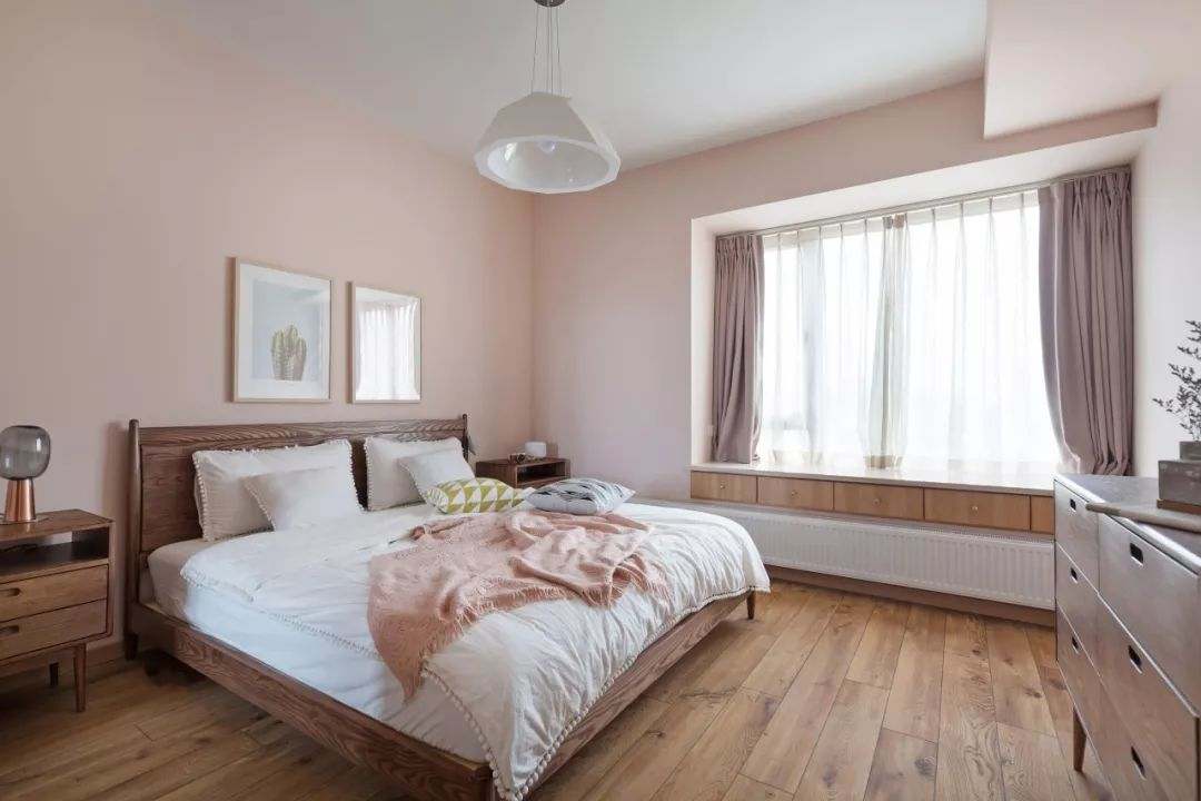 主臥室的墻面刷成了淡淡的粉色,也和窗簾起到呼應(yīng)的效果,飄窗上方的抽屜柜和斗柜、床頭柜集合起來,滿足臥室的收納需求。