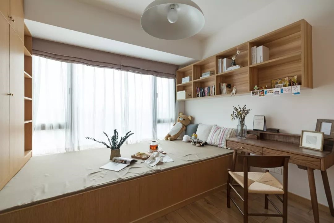 書房內(nèi)部是做了榻榻米床組合衣柜、書桌的設(shè)計,書桌上方開放式的柜子也方便擺放書籍和玩偶、裝飾品,原木風(fēng)為主的設(shè)計顯得格外的自然、簡潔。