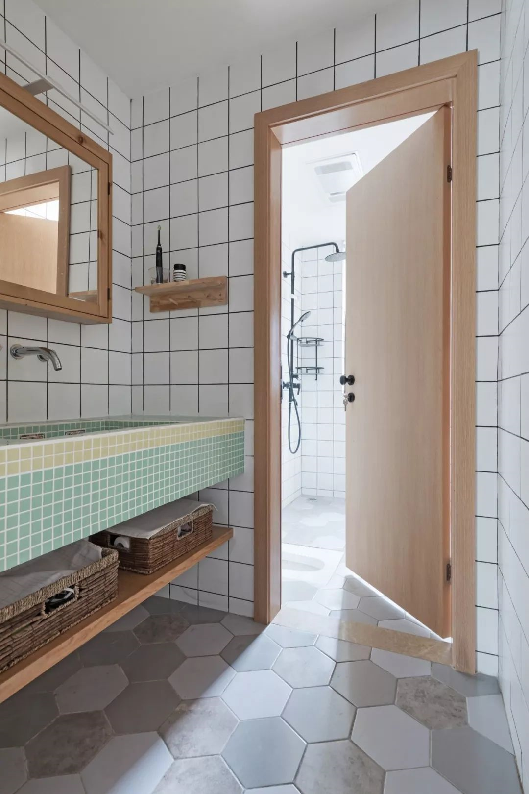 公用衛(wèi)生間的洗手臺被放在了門外,也是方便了屋主一家日常使用。干區(qū)與濕區(qū)都鋪貼了彩色的六邊磚,搭配白色小磚顯得更為文藝清新。