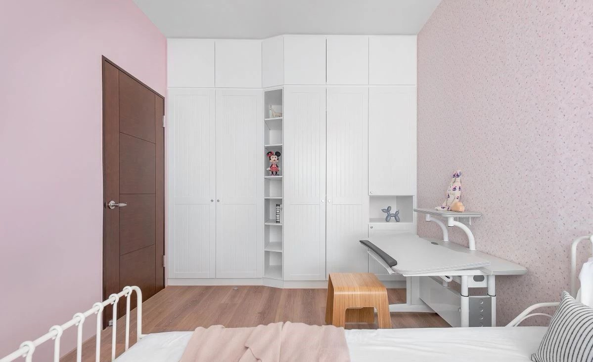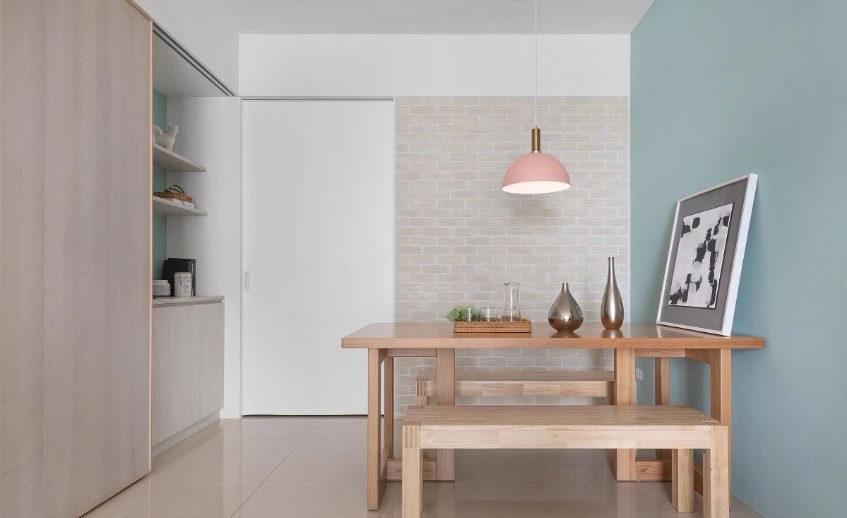 客廳里沒有設置笨重的茶幾,藍灰色的布藝沙發(fā)帶點文藝風,淺灰色的地毯讓人感覺很溫暖。 黃色的懶人椅很休閑風,顏色比較純凈。 電視背景墻采用全木質板,兩邊的墻面粉刷天藍色的乳膠漆,清新自由,擱板下面是白色的矮柜,收納功能很好,既美觀又做了收納。 右邊的電視背景墻上懸掛了六邊形的白色收納,比較有趣,木質的底色與電視背景墻相呼應。 灰色的時鐘很獨特很有個性,利用時鐘的邊角形狀來確定時鐘的刻度,木質擱板上可以放一些收納或者小盆栽,會起到不一樣的裝飾作用。 餐廳 粉色的圓形吊燈讓整個空間都變得可愛起來,淡藍色的背景墻,溫潤質感的文化磚墻面,淡灰粉的收納柜門,原木色的餐桌椅,很小清新。 主臥 北歐風就不是沉甸甸的感覺,一定是這種相對比較明亮的色調,空間都會比較純凈,尤其是墻面的裝飾,一般都是純顏色,不會有圖案的修飾。 在臥室設計電視,也是為了方便業(yè)主在睡覺前休閑放松一下,白色的衣柜門與墻壁融為一體,推拉門不會占據(jù)太多的空間。 飄窗處有一個麻編的衣物籃,有時候穿過的衣服,來不及洗,可以先放在這個籃子里面,第二天再洗。 次臥 次臥的床頭背景墻有一種水面上的波光粼粼的感覺,白色的鐵藝床是北歐風的標志,簡約時尚。 書桌設計在床的旁邊,是為了工作的隨叫隨到,學習時更方便,看書或者工作,累了就往床上一躺,休息一下。 兒童房 兒童房超粉嫩可愛,偏粉色的床頭背景墻,粉色的床頭柜門,和次臥一樣,有一張書桌,便于學習。 大面積的粉色墻壁真的太少女心了,小公主的房間的標配色。 END 圖文源自網(wǎng)絡,若侵權請聯(lián)系刪除