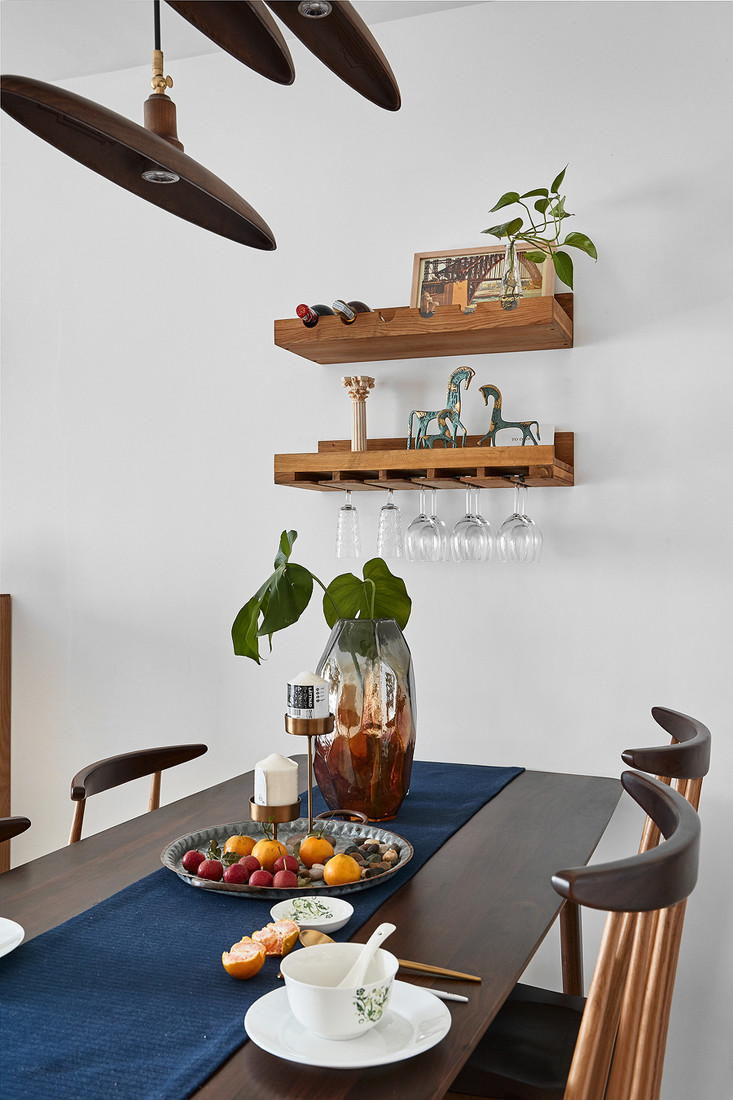 ▲ 深藍(lán)色桌旗濃郁而靜謐,配以精致考究的裝飾擺件與餐具,提升空間格調(diào)與品味。