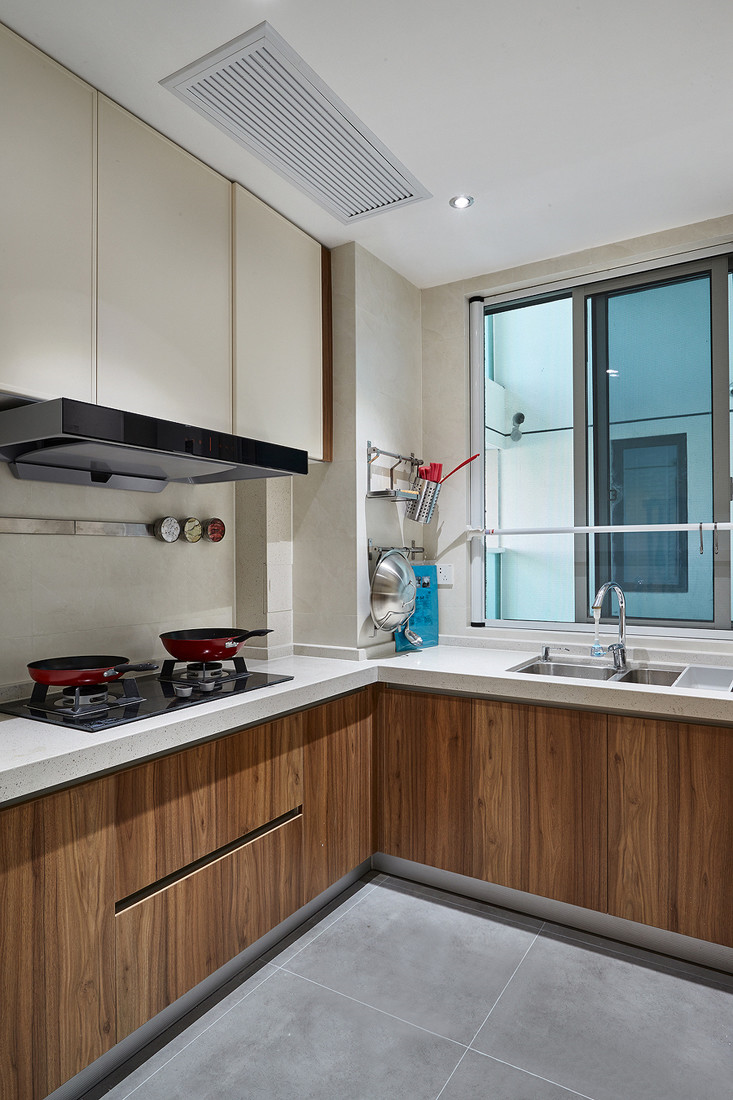 ▲ 廚房擁有豐富的儲(chǔ)物空間,原木色與白色的搭配,令廚房更加潔凈清爽。