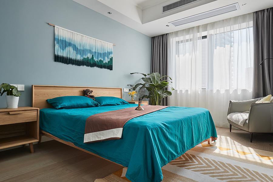 ▲ 主臥,白綠相間成為了將整個(gè)空間連接的線索,從原木的床到湖藍(lán)色的床品,讓臥室顯得清爽舒適。