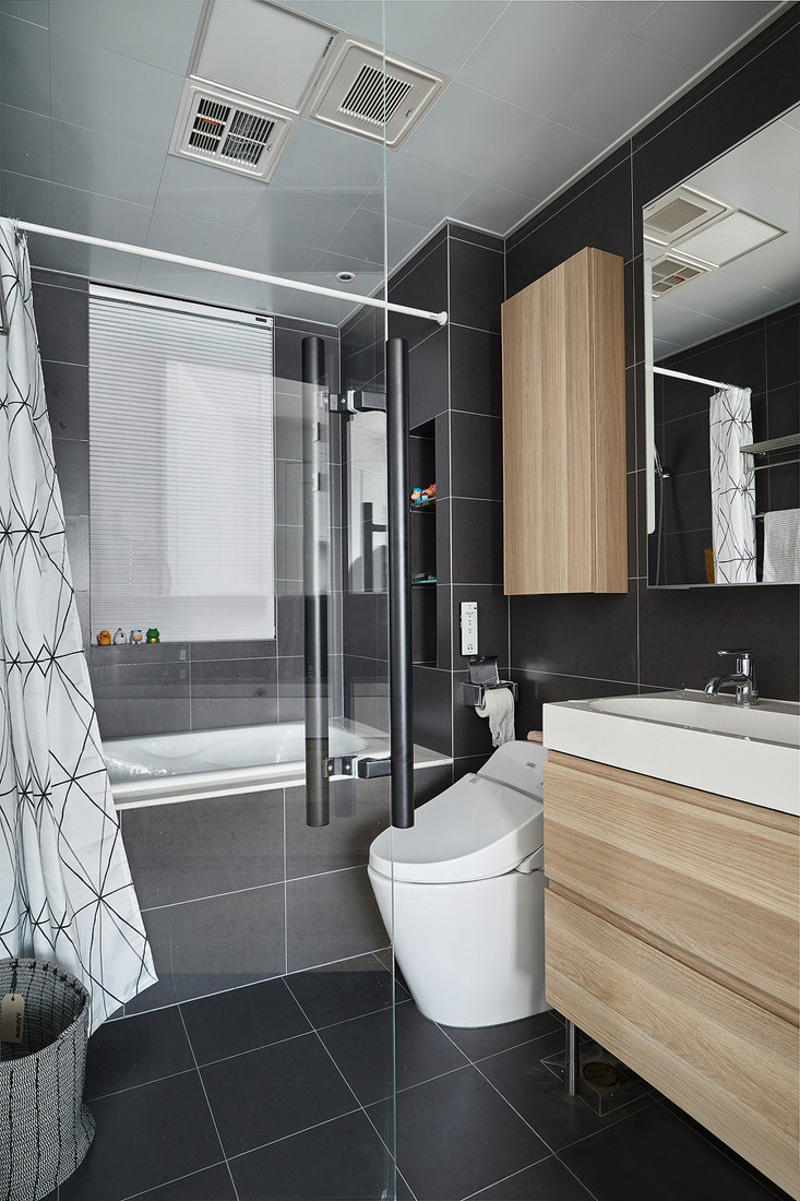 ▲ 衛(wèi)生間鋪設(shè)了深灰調(diào)的墻地磚,配以溫潤(rùn)的木質(zhì)柜體,簡(jiǎn)約時(shí)尚。