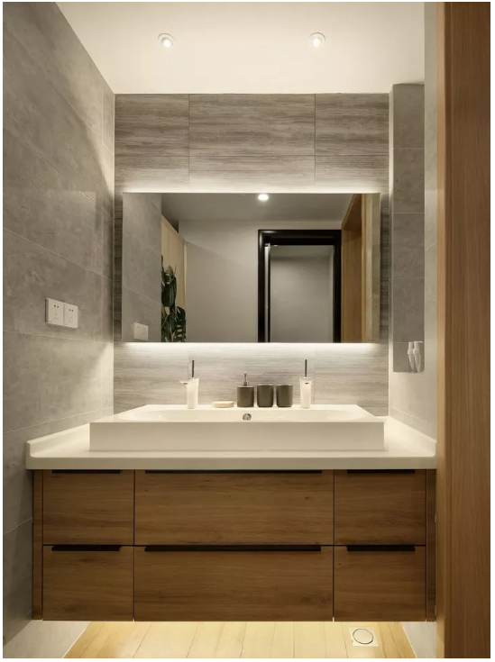 ▲ 洗手臺(tái)盆的柜子做成了懸空的設(shè)計(jì),底部增加了燈光的效果,讓原本陰暗的角落也變得明亮。