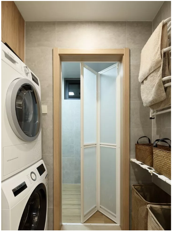 ▲ 洗衣房疊放的洗衣和烘干機(jī),是很好的擺放方式。淋浴間選擇了白色折疊門,自由分隔空間,美觀又大方。