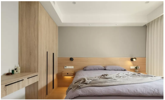 ▲ 主臥床頭背景運(yùn)用了半高護(hù)墻與墻紙相結(jié)合,燈光的裝飾讓整體空間更豐滿。