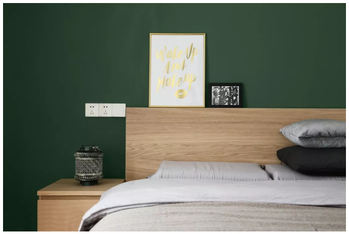 ▲ 次臥的墻紙顏色出挑且沉穩(wěn),與淺色系的家居品形成鮮明對(duì)比。