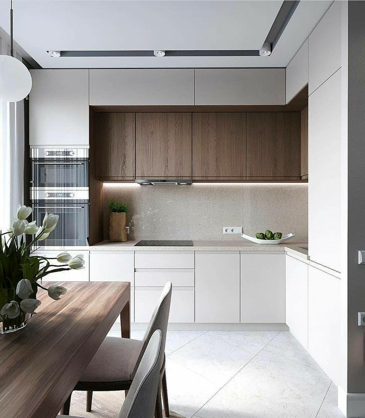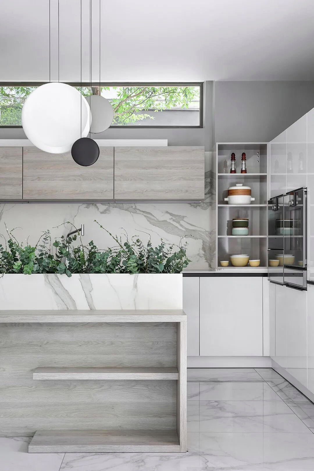 把收納做成隱藏式,柜門外面可以做無拉手設計,即使你家廚房只有幾平米,這樣空間也會看起來更寬闊整潔,不雜不亂。