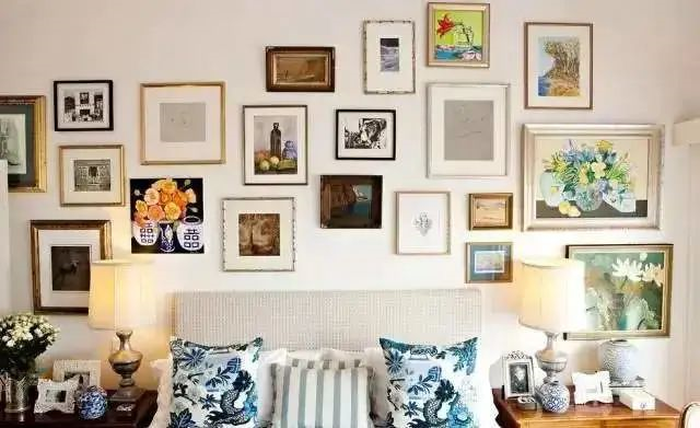 ①讓幾張畫框的下邊在一條水平線上??梢园殉叽缱畲蟮膾飚嫹旁谥虚g,左右補(bǔ)充尺寸稍小的掛畫,自由發(fā)揮即可,只要底邊在一條線上就不會(huì)顯得凌亂。