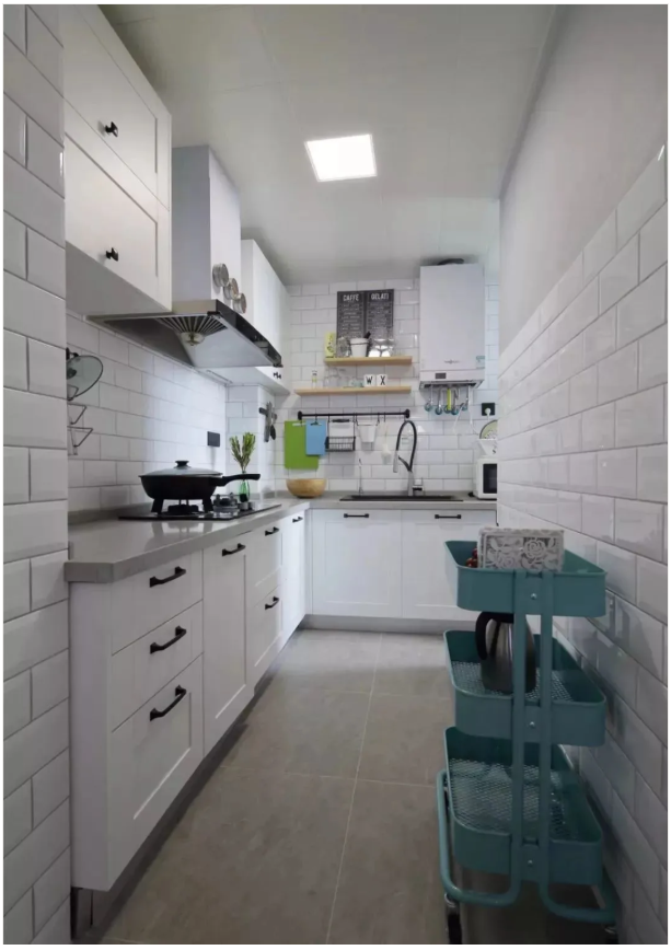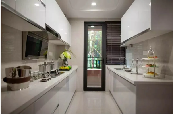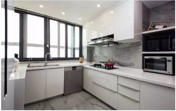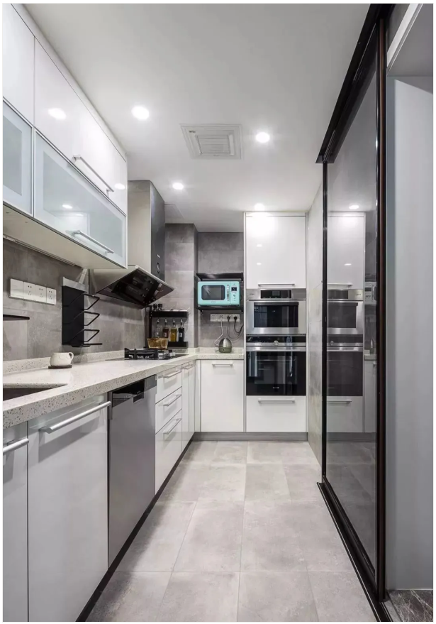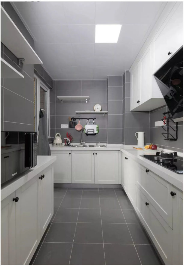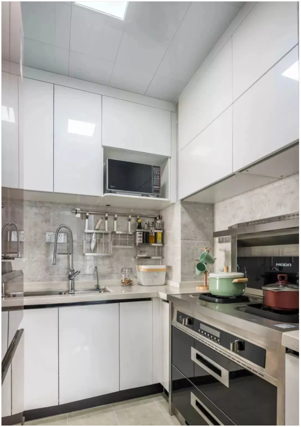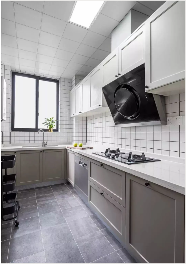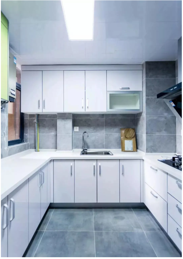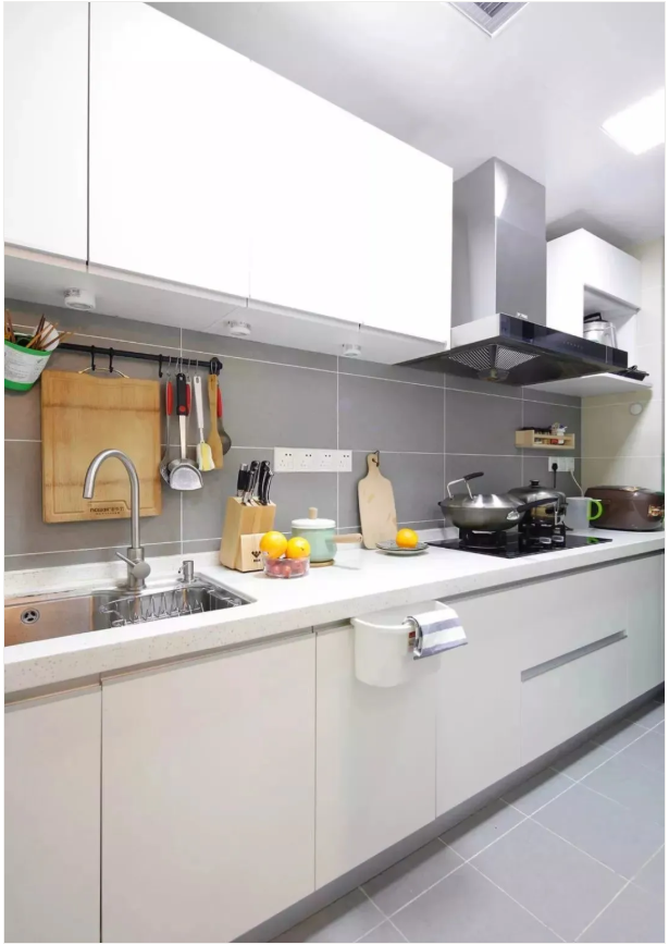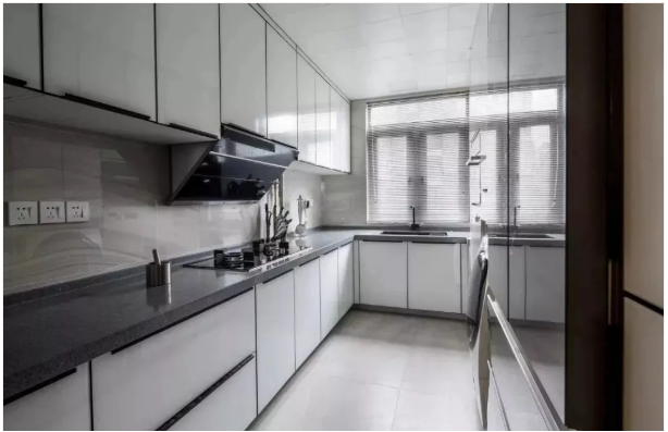 除了亞克力板,對于簡約現(xiàn)代風(fēng)格的廚房,選擇白色的普通板材,搭配上灰調(diào)或黑色,整體空間效果也是非常的簡約自然。