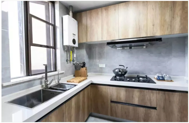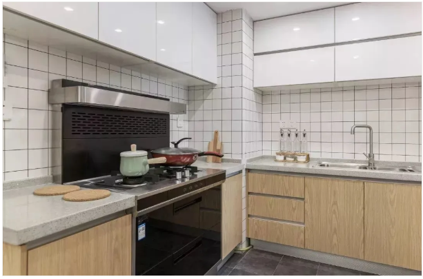 而在中式、美式等風(fēng)格的廚房,則可以選擇實木的櫥柜門板,整體效果更佳端莊高檔,適合有一定經(jīng)濟(jì)條件的家庭。