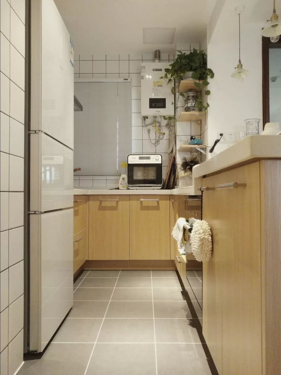 位于餐廳邊上的開(kāi)放式廚房,延伸的吧臺(tái)和櫥柜的中間的墻角設(shè)計(jì)了隔板,用來(lái)擺放綠植和廚房用品,非常的實(shí)用