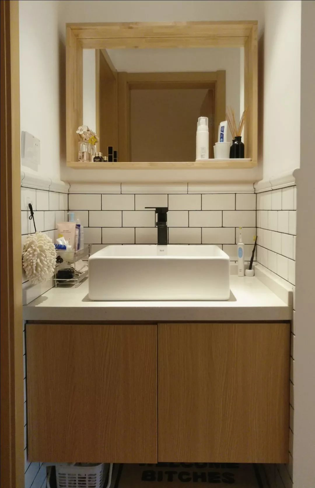 洗手臺(tái)被放在了門外,日常的使用就會(huì)方便許多。鏡子四周的框架剛好可以用來(lái)擺放洗漱用品,非常實(shí)用。